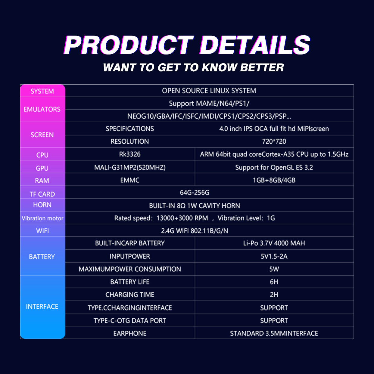 Efficient Connectivity & Battery Life: Equipped with 2.4G Wi-Fi (802.11 B/G/N), a Type-C charging interface, and a 3.5mm audio jack for headphones. The 4000mAh battery ensures up to 6 hours of gameplay, with a quick 2-hour charging time.